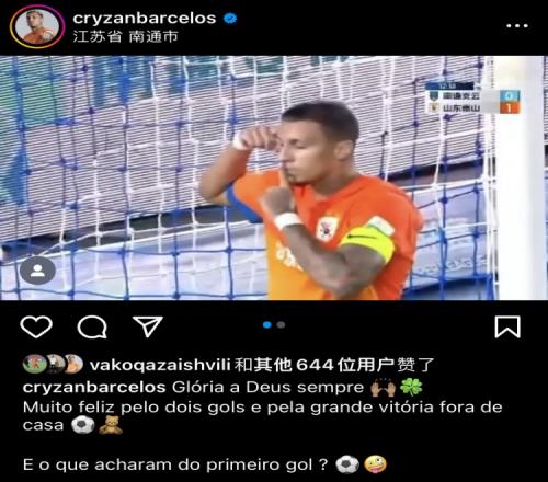 体育资讯7月22日报道宣称 山东泰山客场2-0击败南通支云的赛后,梅开二度包办泰山队两个进球的克雷桑更新了社媒。