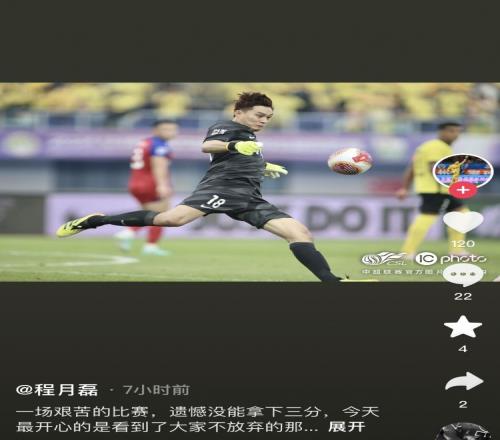 体育资讯7月22日报道宣称 中超第24轮比赛,梅州客家客场3-3战平青岛西海岸。赛后,梅州门将程月磊在社媒发文为球队送上轮鼓励。