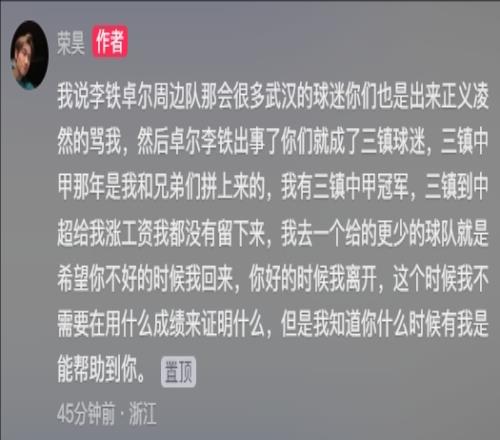 荣昊写道:我说李铁卓尔周边队那会很多武汉的球迷你们也是出来正义凌然的骂我,然后卓尔李铁出事了你们就成了三镇球迷。