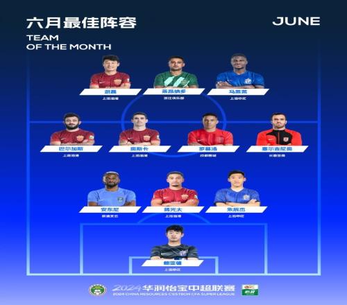 2024中超联赛# 6月最佳阵容出炉,本次最佳阵容采用3-4-3阵型。最佳阵容名单如下: