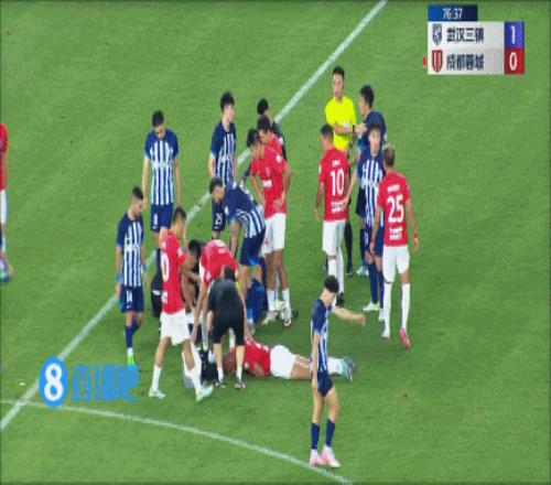 三镇队长任航(镜头上方)狂怼蓉城中场买提江,最终任航等三人吃到黄牌