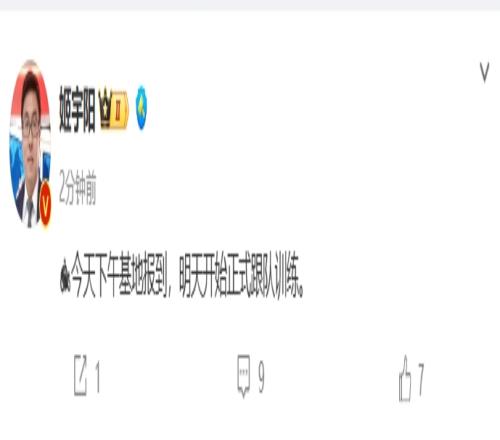 随后媒体人姬宇阳表示,小摩托今天下午基地报到,明天开始正式跟队训练。