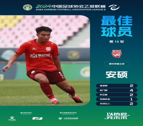 体育资讯7月10日报道宣称 中乙联赛官方消息,廊坊荣耀之城球员安硕当选第15轮最佳球员。