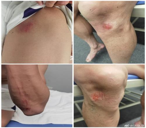 天津津门虎队医在社媒写道:“何止是辛苦,同一人的多处擦伤,金刚砂场地。”