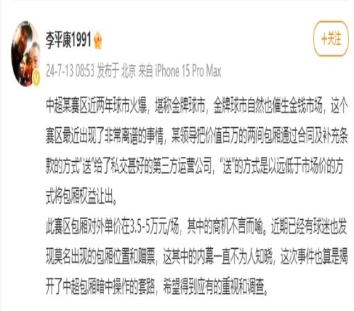 媒体人李平康在个人社媒表示,有中超赛区领导把价值百万的两间包厢通过合同及补充条款的方式“送”给了私交甚好的第三方运营公司。