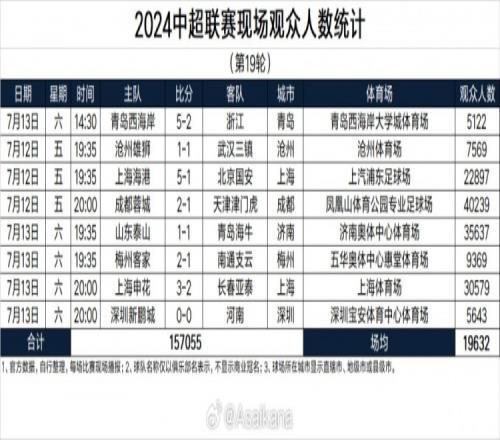 2024中超联赛现场观众人数统计(第19轮)