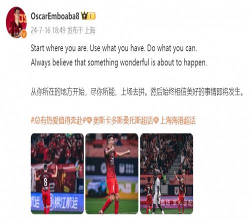 体育资讯7月16日报道宣称 近日,围绕海港外援奥斯卡是否续约的讨论不断。奥斯卡在个人微博中晒出了图片,并写道:从你所在的地方开始,尽你所能,上场去拼。然后始终相信美好的事情即将发生。