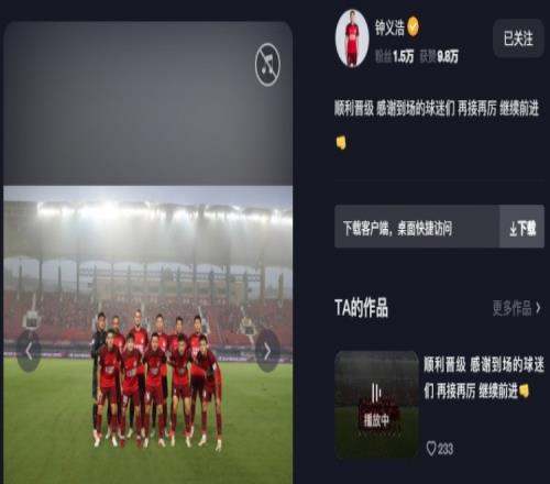 赛后,钟义浩在社媒发文庆祝晋级:“顺利晋级,感谢到场的球迷们,再接再厉,继续前进。”