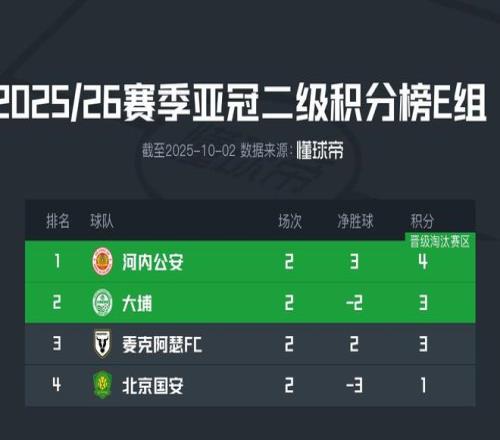 亚冠二级联赛E组战罢两轮,中超球队北京国安积1分小组垫底,河内公安积4分领跑,麦克阿瑟与大埔积3分。