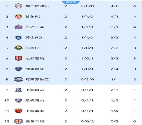 最新积分榜方面,唯一取得连胜的神户胜利船以6分独自领跑。首尔FC、广岛三箭、蔚山HD三支1胜1平的球队同积4分,分列第2至第4。