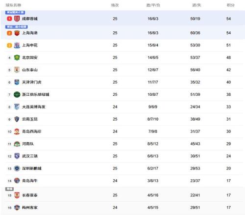 随着申花11蓉城,国安23海港,中超积分:3队争冠,1队掉链子