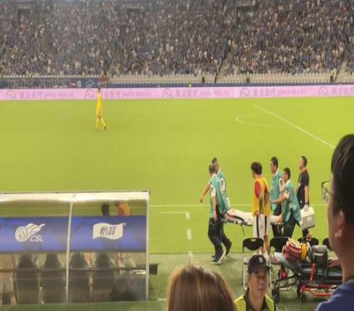 韦世豪被担架抬下球场。 澎湃新闻记者 杨一 图