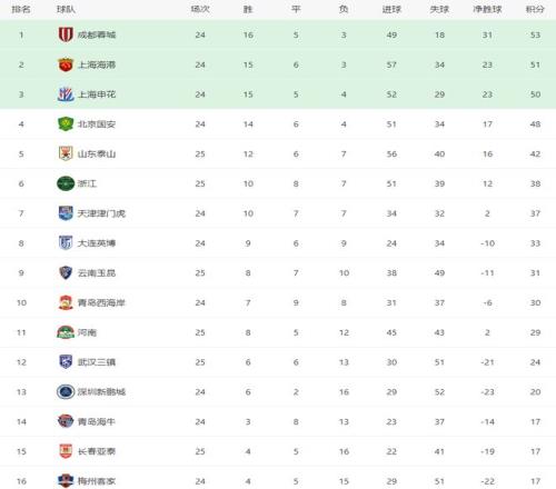 成都蓉城、上海海港、上海申花、北京国安稳居积分榜前四,本轮联赛四队捉对厮杀,将在本周日晚上进行。此外,长春亚泰、梅州客家、青岛海牛的保级形势最为严峻,两个降级名额大概率将在以上三队产生。