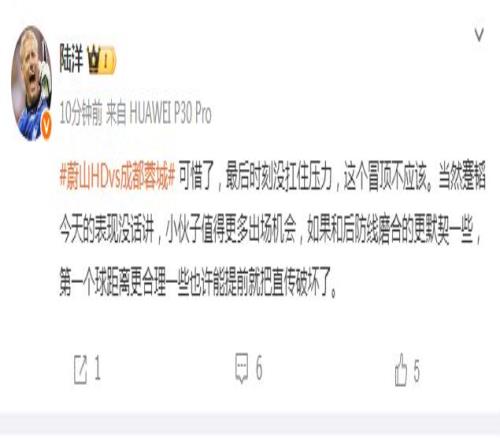 媒体人陆洋表示,蓉城被逆转绝杀太可惜,“可惜了,最后时刻没扛住压力,这个冒顶不应该。当然蹇韬今天的表现没话讲,小伙子值得更多出场机会,如果和后防线磨合的更默契一些,第一个球距离更合理一些也许能提前就把直传破坏了。”