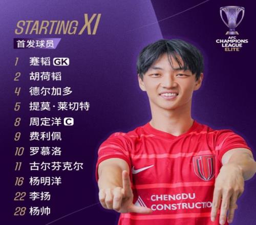 成都蓉城首发:1-蹇韬、2-胡荷韬、5-提莫-莱切特、11-古尔芬克尔、22-李扬、28-杨帅、4-德尔加多、8-周定洋、10-罗慕洛、16-杨明洋、9-费利佩