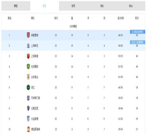 中超25赛季23轮赛程过后,积分榜前五依次是积50分的成都蓉城,积49分的上海申花,积48分的海港和国安,积40分的山东泰山。