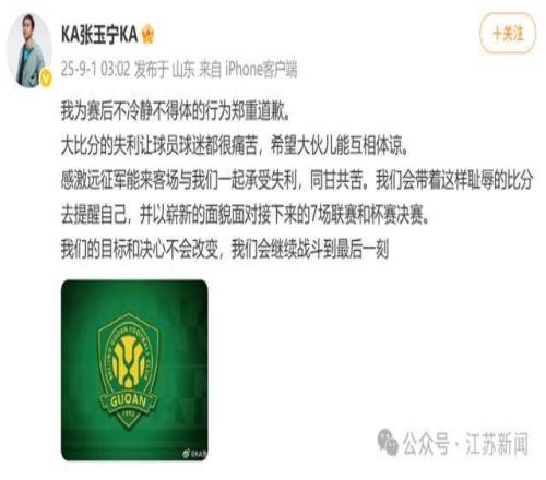 9月1日凌晨,张玉宁在社交平台发文致歉:“我为赛后不冷静不得体的行为郑重道歉。大比分的失利让球员球迷都很痛苦,希望大伙儿能互相体谅。感激远征军能来客场与我们一起承受失利,同甘共苦。我们会带着这样耻辱的比分去提醒自己,并以崭新的面貌面对接下来的7场联赛和杯赛决赛。我们的目标和决心不会改变,我们会继续战斗到最后一刻 。”