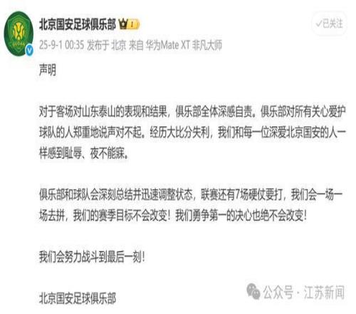 国安俱乐部在9月1日凌晨0点35分发布声明称:“对于客场对山东泰山的表现和结果,俱乐部全体深感自责。俱乐部对所有关心爱护球队的人郑重地说声对不起。经历大比分失利,我们和每一位深爱北京国安的人一样感到耻辱,夜不能寐。俱乐部和球队会深刻总结并迅速调整状态,联赛还有7场硬仗要打,我们会一场一场去拼,我们的赛季目标不会改变!我们勇争第一的决心也绝不会改变!我们会努力战斗到最后一刻!”