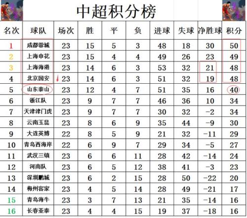 积分榜方面,本轮的争夺可谓乱了套,前三的申花,上港和国安全部输球,这样的击败上海海港的成都蓉城就逆袭成功,以1分优势力压申花真正将榜首位置拿到手,申花跌到了第2。随着国安0:6惨败,上海海港净胜球优势,躺着回到前3,国安则是跌到第4。山东泰山这边,一场狂胜,让他们看到了些许的争3希望,现在他们落后上港和国安8分,稳居第5。