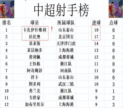 射手榜方面,卡扎伊什维利上演大四喜好戏后,超过法比奥2球,一举反超登顶成功,法比奥17球跌到第2。基莱斯14球第3,莱昂纳多13球排第4。加布里埃尔,弗兰克和韦世豪9球刚好挤入前十。