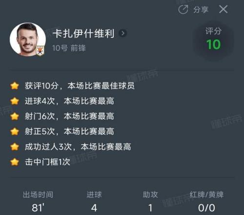 第一个,卡扎伊什维利本轮联赛贡献了4球1助攻,这是什么概念,之前的中超最佳球员,很多都是进2个球,或者1球1助攻就可以,卡扎伊什维利这完全是降维打击,另外,他这场比赛更是6项数据高居第一,除了进球之外,还有3次成功过人和1次击中门框,获评全场最高的10分满分。