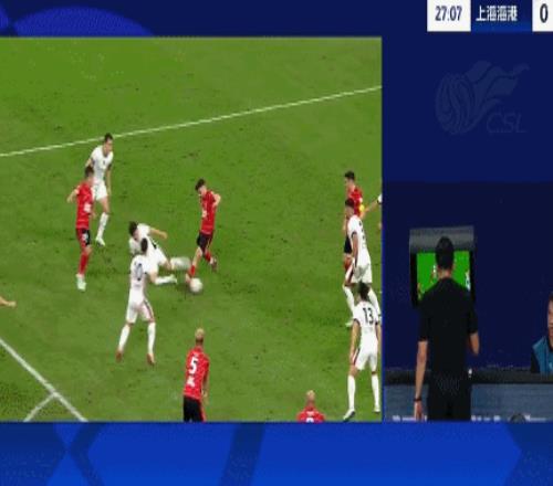 第26分钟,杨世元禁区内铲倒古尔芬克尔,主裁判并未判罚点球。随后,视频助理裁判介入判罚,并且要求主裁判回看慢镜头。