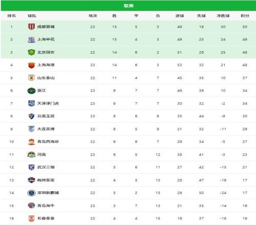 随着海港14蓉城,亚泰11,中超积分:第1名换队,5队成降级热门