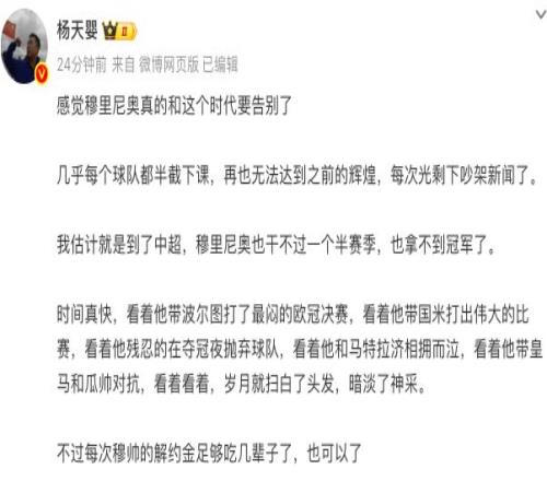 “时间真快,看着他带波尔图打了最闷的欧冠决赛,看着他带国米打出伟大的比赛,看着他残忍的在夺冠夜抛弃球队,看着他和马特拉济相拥而泣,看着他带皇马和瓜帅对抗,看着看着,岁月就扫白了头发,暗淡了神采。不过每次穆帅的解约金足够吃几辈子了,也可以了。”