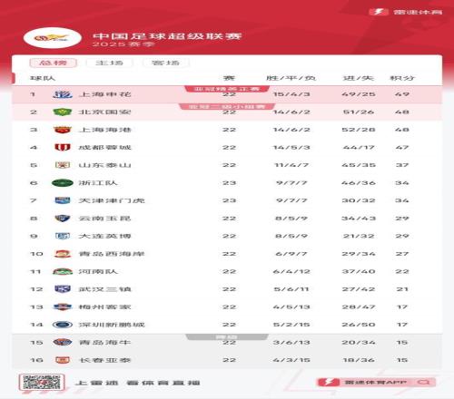 申花以1分优势暂高居榜首,蓉城以1分之差紧追北京国安、上海海港。