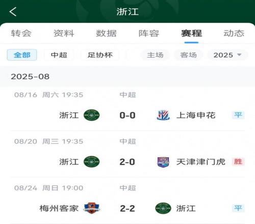 直播吧08月24日报道宣称 中超第22轮,津门虎1-1客平海港,浙江2-2客平梅州。
