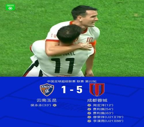 8月23日19:35,中国足球超级联赛第22轮,云南玉昆坐镇主场迎战成都蓉城。上半场比赛中,周定洋补射破门,随后侯永永扳平;下半场,韦世豪助攻费利佩完成梅开二度,随后,廖荣祥、李漠雨两位小将替补登场均攻入个人中超首球。最终,成都蓉城客场以5比1战胜云南玉昆。