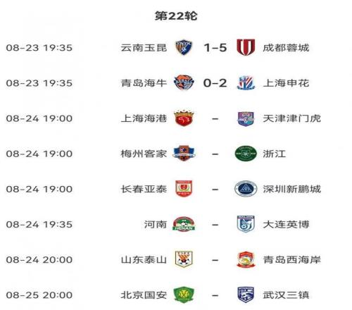 直播吧08月23日报道宣称 中超第22轮的前两场比赛结束,蓉城5-1客胜玉昆,申花2-0客胜海牛。