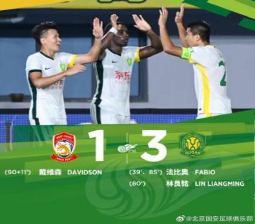 易边再战,北京国安连续做出人员调整。第59分钟,柏杨在门线前解围,将对方的射门拒之门外。第75分钟,塞尔吉尼奥反击中的单刀射门,同样也被对方后卫挡出。第80分钟,张稀哲右路主罚任意球,林良铭中路抢点头球破门,为球队扩大比分!第85分钟,张稀哲右路再送完美弧线,法比奥冲顶再入一球,继续领跑中超射手榜!补时阶段,对方由戴维森主罚点球扳回一分。