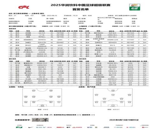 北京时间8月16日19:35,中超第21轮展开较量,浙江坐镇主场迎战上海申花。赛前双方首发公布。