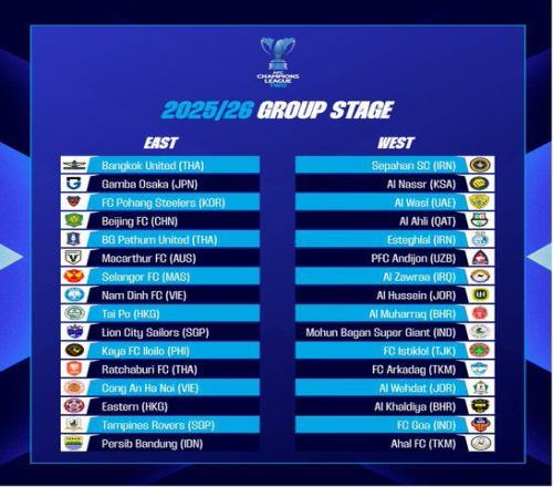 二档:巴吞联(泰国)、麦克阿瑟FC(澳大利亚)、雪州(马来西亚)、南定绿钢(越南)