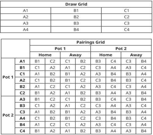 东西亚区12支球队均分为两档,各协会冠军球队为第一档(对应A1、B1、C1、A2、B2、C2),其余为第二档(A3、B3、C3、A4、B4、C4)。每支球队都遇到4支一档球队和4支二档球队。