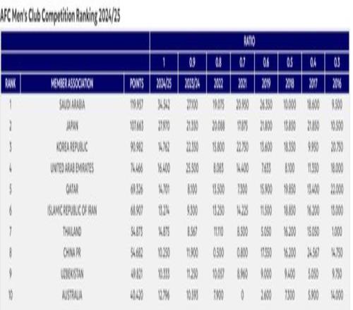 2024-25赛季结束之后,中超在亚足联技术积分排名榜上以54.682分排名第8位,而泰超(54.873分)则以0.191分的优势排名第7位。这是自1994年职业化以来,中超首次被泰超超过,这导致中超2026-27赛季的亚冠参赛席位少了一个。