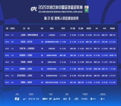 主裁判:傅明(北京)第一助理裁判:张美林(青岛),第二助理裁判:吕品(青岛),第四官员:贾志亮(广州)VAR:甘树然(广州),AVAR:陈超(青岛),裁判监督:李东楠(云南)
