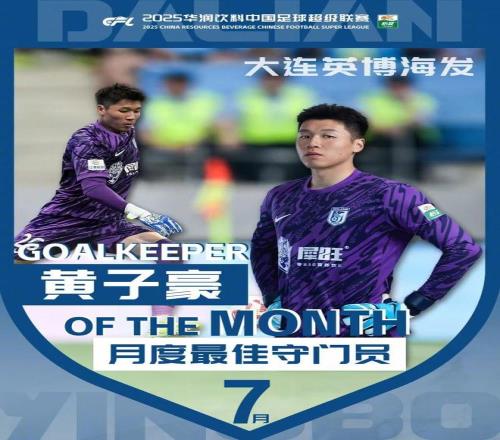 直播吧8月14日报道宣称 中超联赛官方公布了7月最佳守门员人选,大连英博俱乐部门将黄子豪当选,两场比赛中黄子豪镇守的球门从未被攻破,扑救成功率100%。