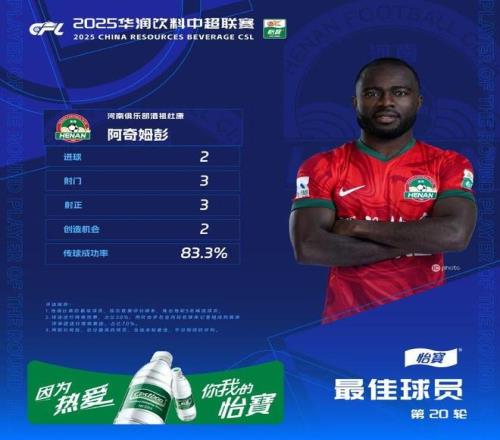 梅开二度!中超官方评第20轮最佳球员:河南队外援阿奇姆彭当选