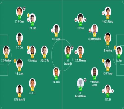 中前卫:9-安德烈-路易斯(F)、15-吴曦、17-高天意(70'10-特谢拉(F))