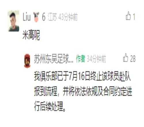 苏州东吴官方:已于7月16日终止米高赴队报到流程将依法依规处理