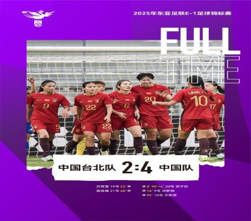 全场比赛结束,邵子钦梅开二度,沈梦雨建功,王妍雯世界波破门,中国女足4-2战胜中国台北女足,取本届东亚杯首胜。