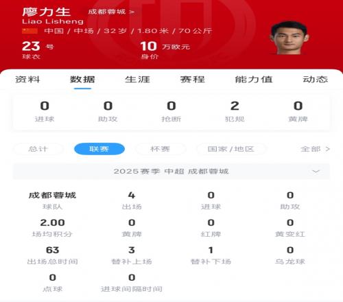 廖力生现年32岁,今年2月份自由身加盟成都蓉城。本赛季代表成都蓉城出战4场中超,出场时间63分钟。