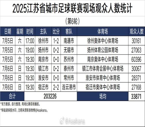 体育资讯07月06日报道宣称 江苏省城市足球联赛第六轮战罢,德转朱艺统计了本轮“苏超”场均观赛人数以及总人数。值得一提的是,第六轮总计超20万人现场观赛,场均人数为33871,再次刷新了纪录。