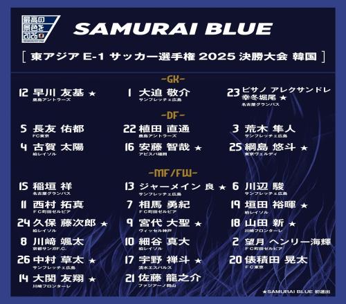 门将:12-早川友基(鹿岛鹿角)☆、1-大迫敬介(广岛三箭)、23-幸冬堀尾(名古屋鲸八)☆