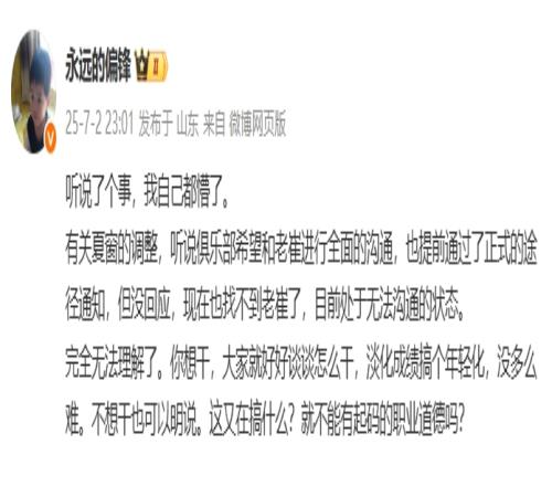 有关夏窗的调整,听说俱乐部希望和老崔进行全面的沟通,也提前通过了正式的途径通知,但没回应,现在也找不到老崔了,目前处于无法沟通的状态。