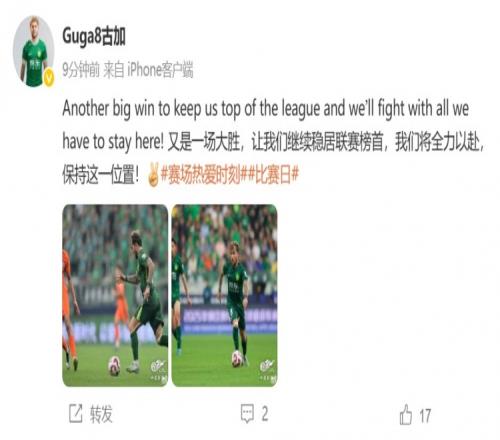 中超第16轮,北京国安主场2-1击败云南玉昆,继续领跑积分榜,古加赛后更新社媒庆祝,他写道:又是一场重要的胜利,让我们继续稳居联赛榜首,我们将全力以赴,保持这一位置!