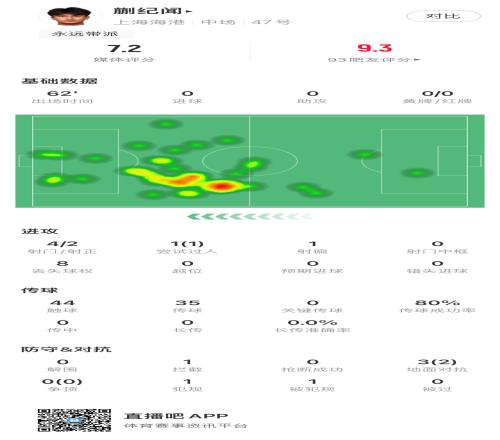 本场表现如何蒯纪闻本场数据:4射2正,传球成功率80%,评分7.2