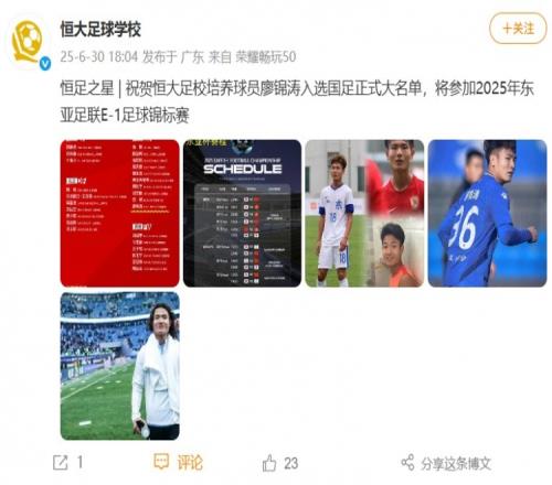 出自恒大足校!恒大足校祝贺廖锦涛首次入选国足大名单